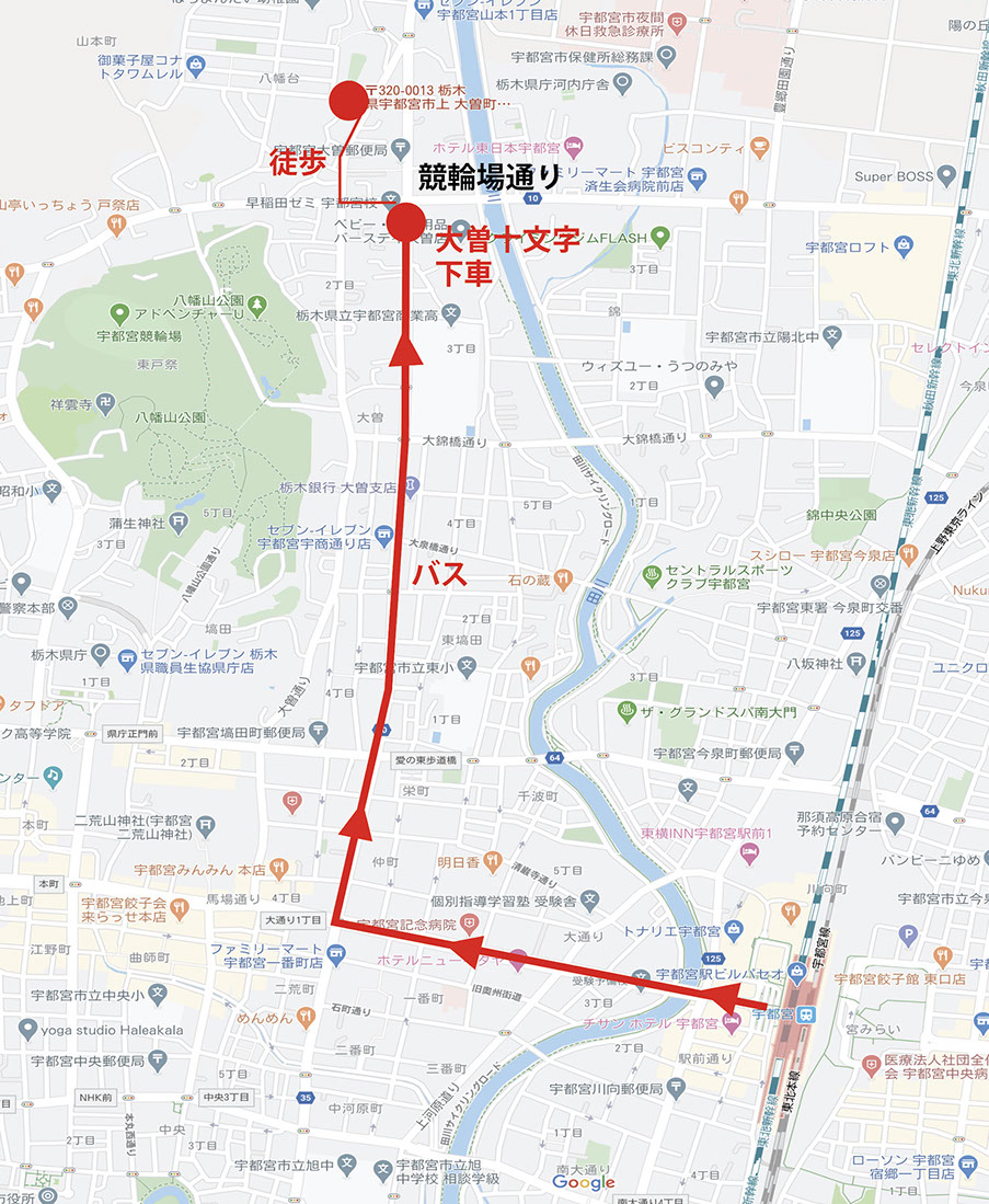 4番バス停 宇都宮美術館、帝京大学行き方面に乗り「大曽十文字」下車