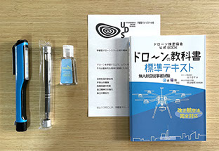 ご受講の方(基礎技能)は、上記のドローンの教科書、携帯アルコール、オリジナルボールぺン、オリジナルLEDドローンパイロットライトを差し上げております。。
